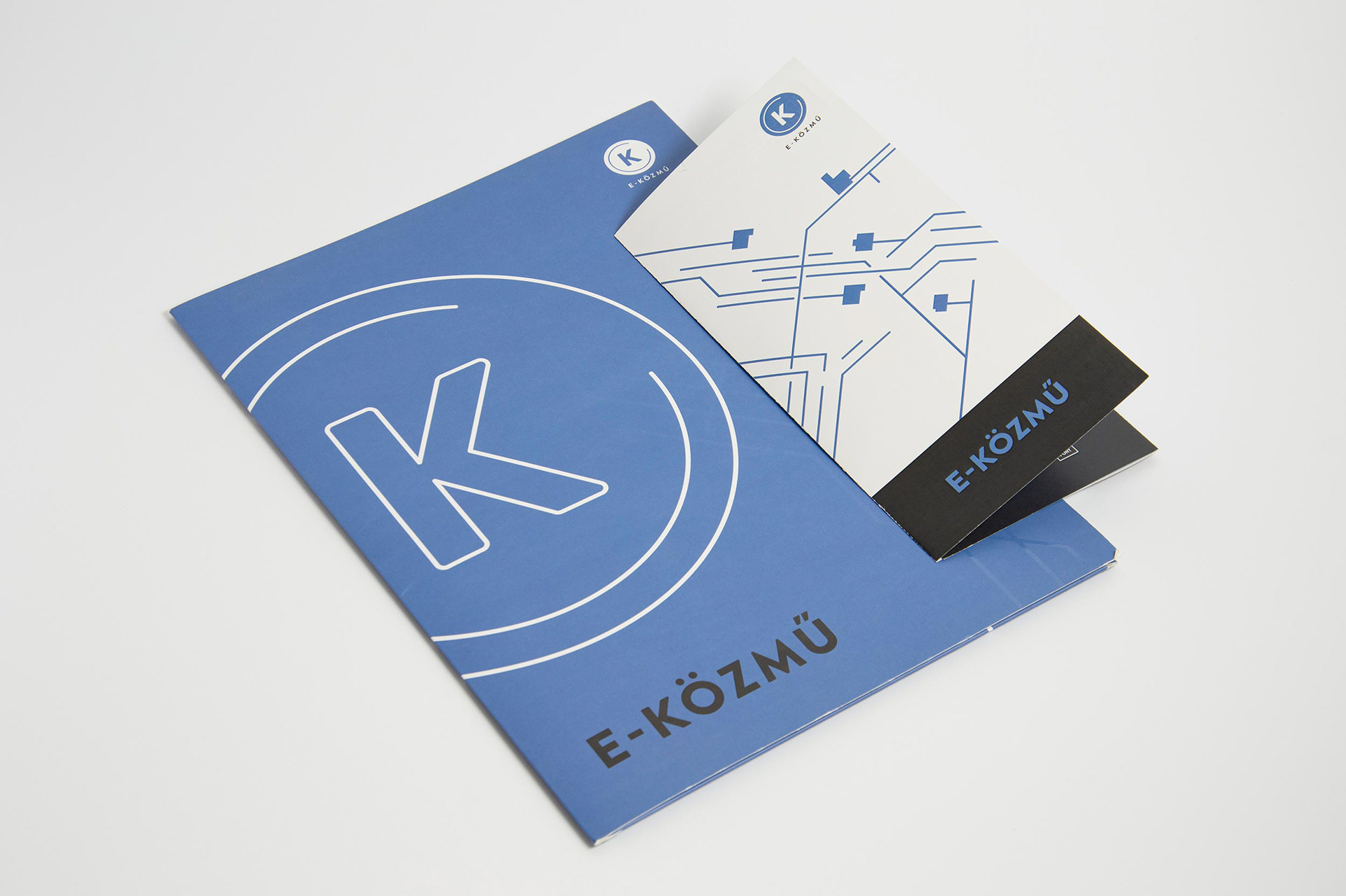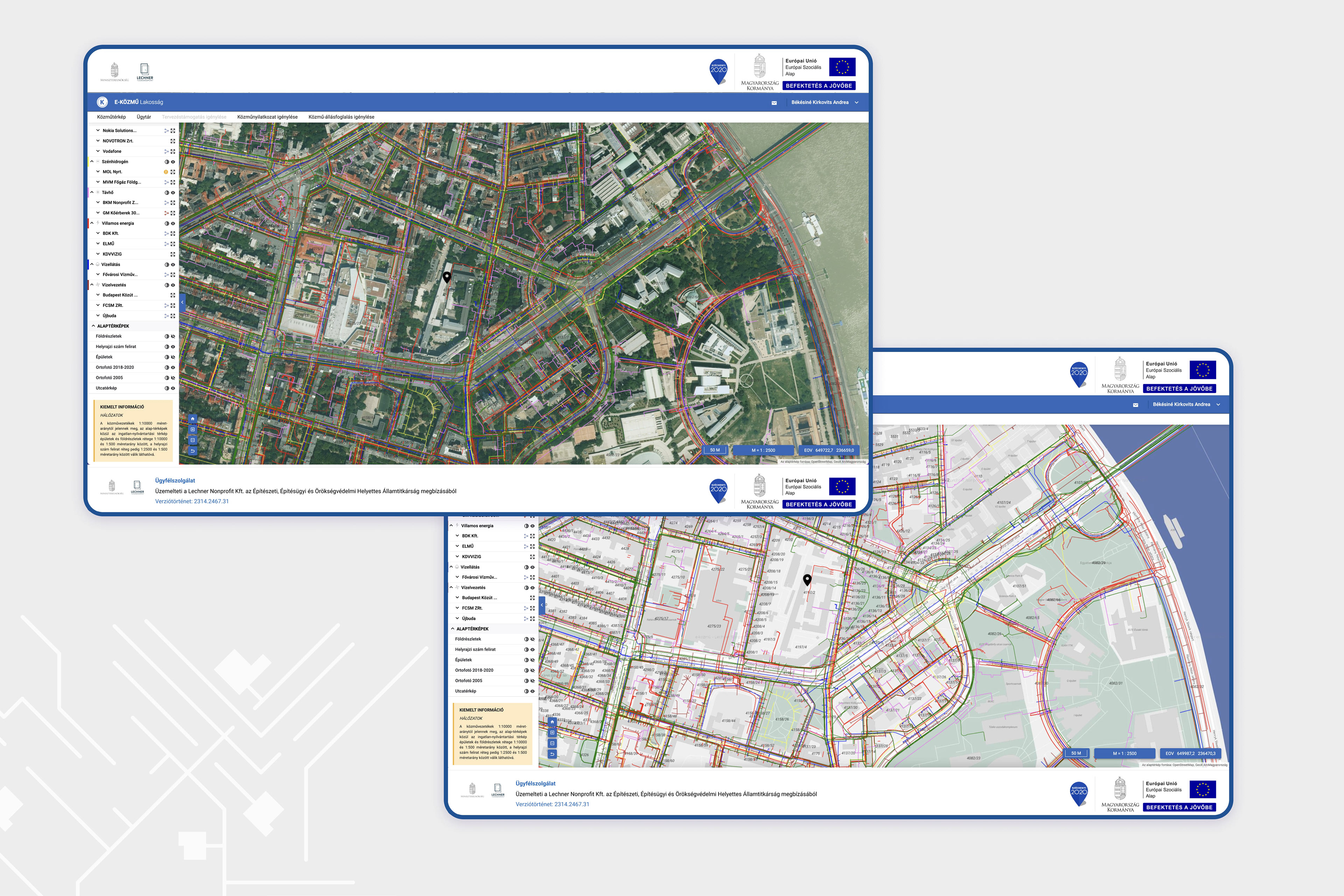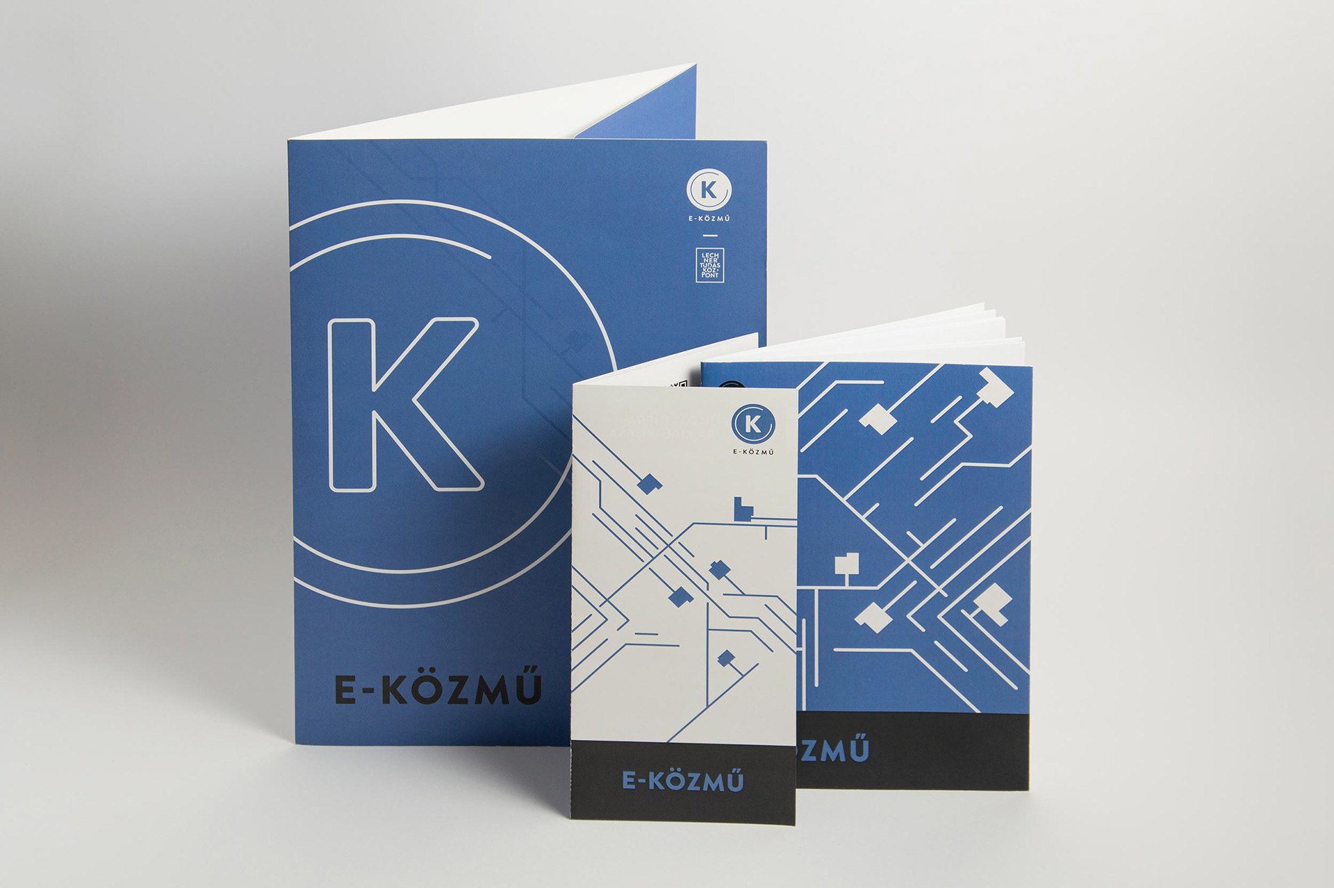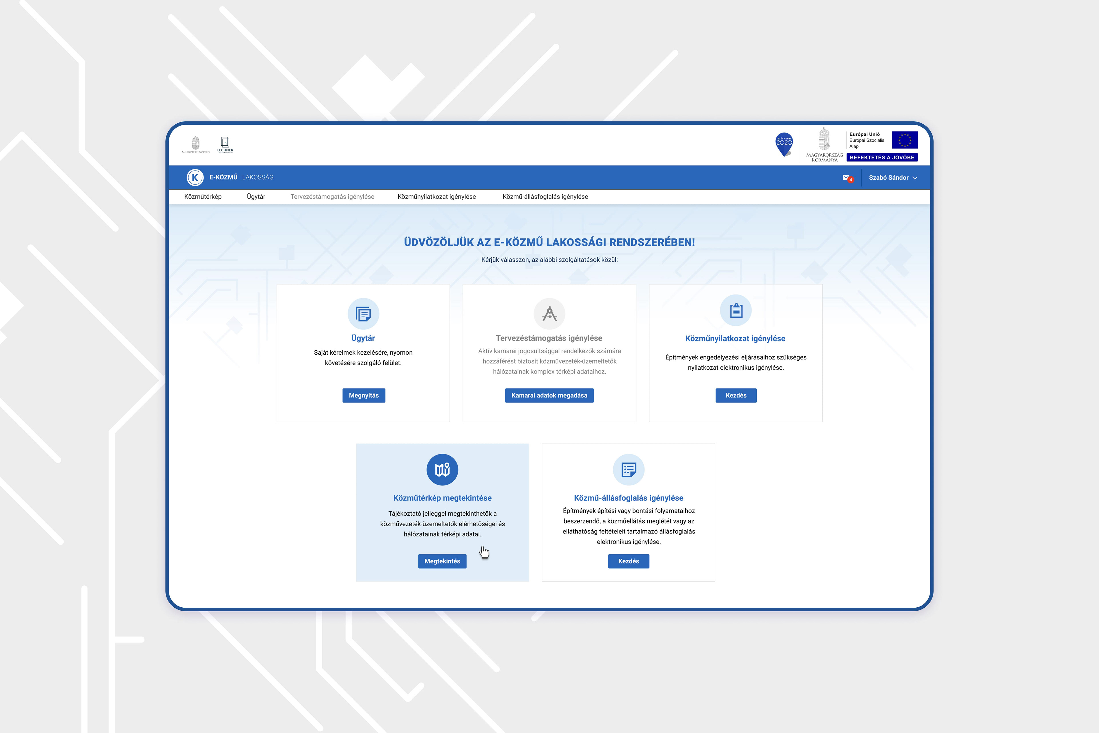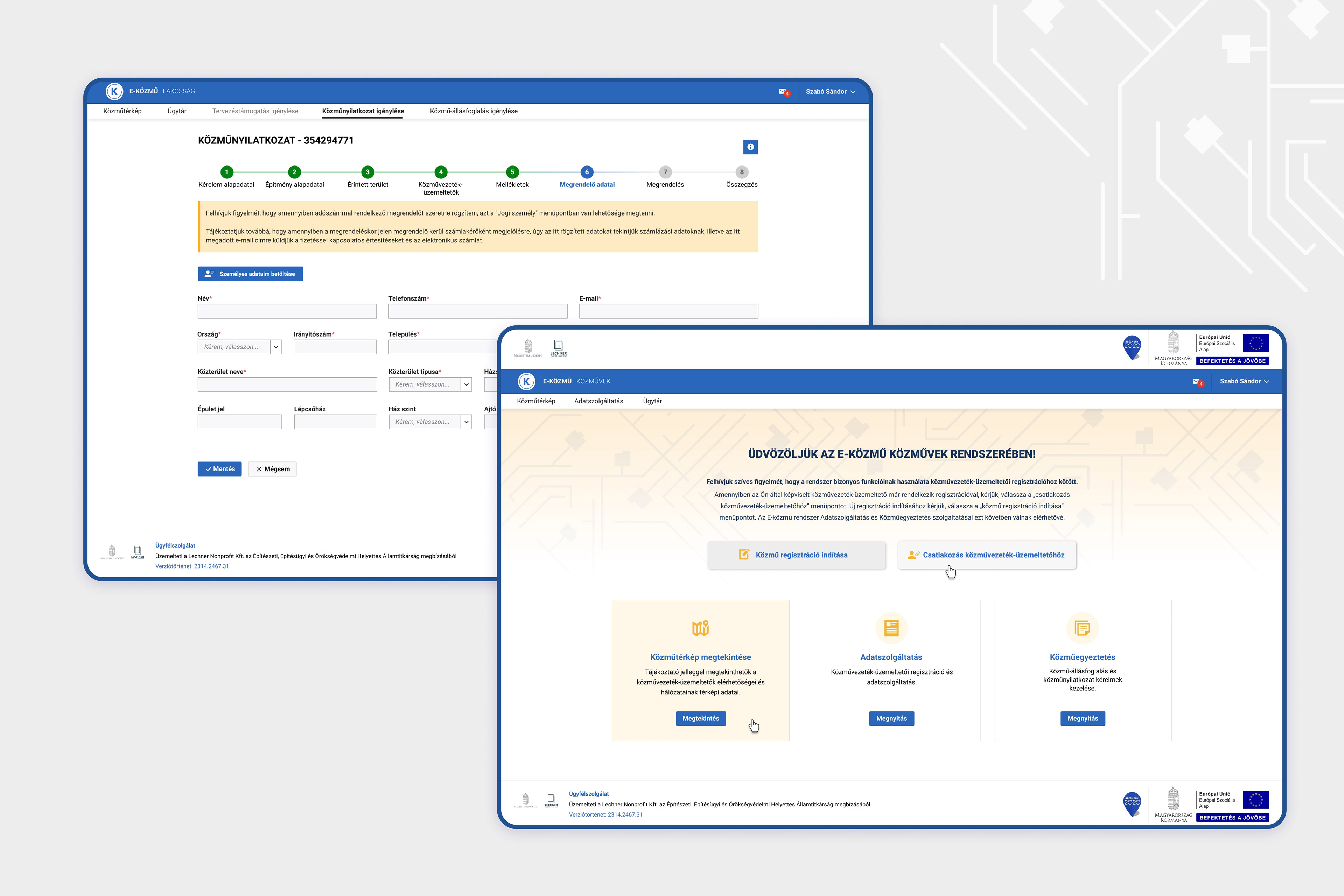 Az e-epites.hu oldalról elérhető szolgáltatás felhasználói felülete szintén a keretrendszer komponenseivel készült, de a projekt céljait előtérbe helyezve gördülékeny, felhasználóbarát megjelenést kapott. Egyszerű főoldalán öt szolgáltatás kártyája közül választhatunk, melyek felismerését piktogramok is segítik. Interaktív térképes felületén különböző rétegeken láthatók a közműhálózatok. Ezekből mintázat készült, ami az E-közmű arculatában design elemként jelenik meg webes és nyomtatott anyagokon egyaránt.